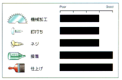- 手作業でも機械でも加工しやすいが、木目のよじれがある場合は、毛羽立ちを避けるためにも注意が必要。釘やネジに適し接着に優れる。サンダー加工、つや出しできれいに仕上がる。乾燥が短時間で済み、狂いもほとんどないが、乾燥ムラが出やすい。乾燥後の安定性は高い。