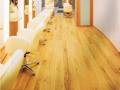 カットコーナーから通路側をみる。4種類の巾の製材が貼られていることが分かる。随所に見られる節や色違いといったキャラクターマークが自然感を強く感じさせる。