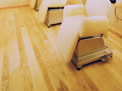 シャンプーコーナー。床はホワイトアッシュ。水や洗髪剤類が日常的に飛び散ることから当初は磁気質のタイルが予定されていたが、ウレタン系のオイルを含浸させることで撥水性を持たせ、数日経過後にふき取ってもシミにならないことが分かり、ホワイトアッシュが採用された。