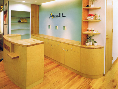 受付。手前と奥のカウンターにはメープルとチェリーが採用されている。床はレッドオーク。