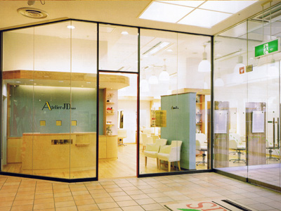 エントランス側外観全景。ビルの入口に面しているため外部からもよく見渡せる店内。アメリカ広葉樹に合わせ白とアクセントカラーのブルーだけが使われている。