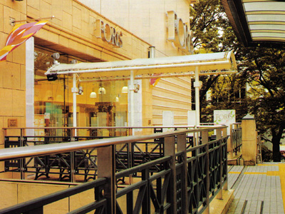 京王線府中駅の南口につながる伊勢丹フォーリス2階のアプローチ。正面には大國魂神社の参道の見事なけやき並木が生い茂り、駅前とは思えない雰囲気を醸し出している。
