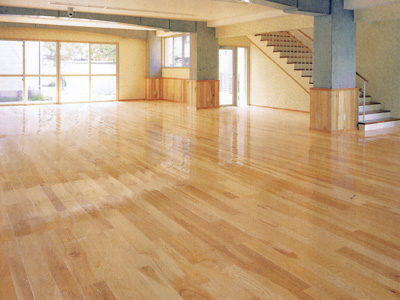 保育の必要な日数の約半分が雨という気象条件に合わせ、室内で遊ぶための広い遊戯室。キャラクターマークにより自然感の強いホワイトアッシュの床にチューリップウッドの腰板、レッドオークの巾木。右手階段はチェリー。
