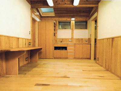 診察室1。正面は流し兼収納カウンター。床はイエローバーチ。腰壁はホワイトアッシュ、カウンターはメープル。