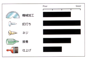 - 心材は耐朽性がないが、防腐処理は非常に難しい。