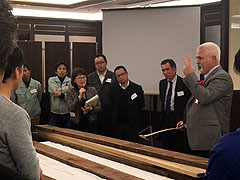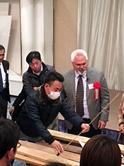 講師には全米広葉樹製材協会(NHLA)で主席等級検査官を務めるディナ・スペサート氏が来日。地元の木材問屋の協力を得て、実際のアメリカ広葉樹製材を会場に持ち込み、スペサート氏が持参した「ルーラー」と呼ばれるアメリカ広葉樹製材を計測する専用物差しを使用して、製材を測り歩留り計算をして等級を分けるなど、参加者が実際に作業し、細かな説明を受けながら体験していただきました。