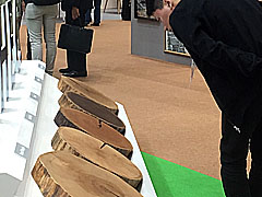 ブースに設置した3本のモニュメントツリーの幹はアメリカ広葉樹輸出協会のメンバー企業であるノースウエストハードウッド社から寄贈されたウォルナット、レッドオーク、アルダー、ホワイトオーク、チェリー、ハードメープル。そして西海岸に生息するPCメープルの製材がアレンジされアメリカ広葉樹林の豊かさを表現しました。